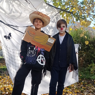 Letos jsme se rozhodli oslavit Halloween nejen v hodinách angličtiny, ale i společně. Uspořádali jsme celoškolní zahradní párty o velké přestávce. Osmáci ráno pomohli připravit strašidelnou výzdobu. Děti donesly různé tematické občerstvení, dostaly samolepky dýní a příšer, tančily na Halloweenské písně, hrály si na mumie a vytvořily dlouhatánský řetěz masek přes celou zahradu. Spoustu legrace jsme si užili ve fotokoutku, o který se staraly holky z osmičky. Všem to (hrůzo)strašně slušelo!