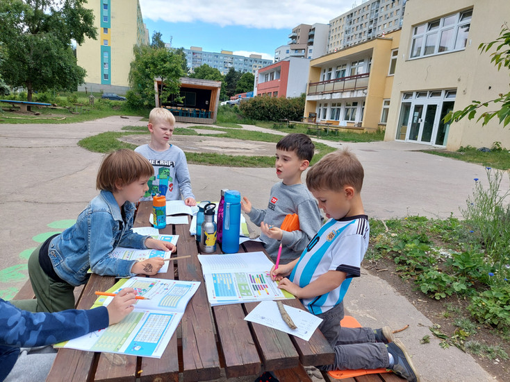 V matematice jsme byli ve třídě i venku. Luštili jsme hádanky. Poslední byla nejtěžší. Ve středu nám Mirka dala úkol najít v dětském parku obdélníky. Našla jsem jich 69. Hledali jsme taky barevné cestičky a zapisovali je do tabulky. Každý den jsme i počítali.