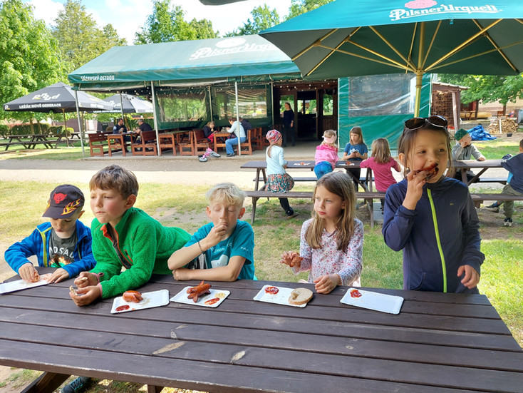 Za odměnu, že jsme pomáhali se dřevem, jsme si mohli opéct buřt.